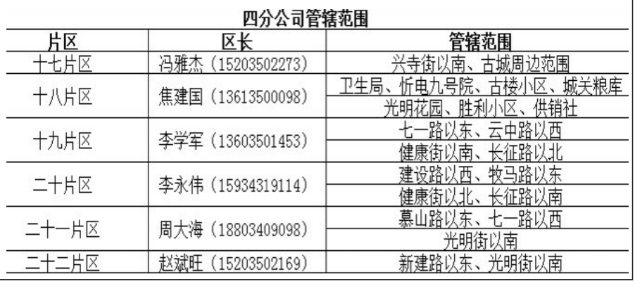 近期,忻州熱力有限公司收到很多用戶上門反饋,普遍反映客服熱線占線時(shí)間太長(zhǎng),無法及時(shí)反映供熱情況,導(dǎo)致用戶遇到供熱相關(guān)問題或故障無法及時(shí)反饋。根據(jù)群眾目前遇到的困難,忻州熱力有限公司公布了22個(gè)供熱片區(qū)及負(fù)責(zé)人聯(lián)系方式,以便用戶及時(shí)反饋。