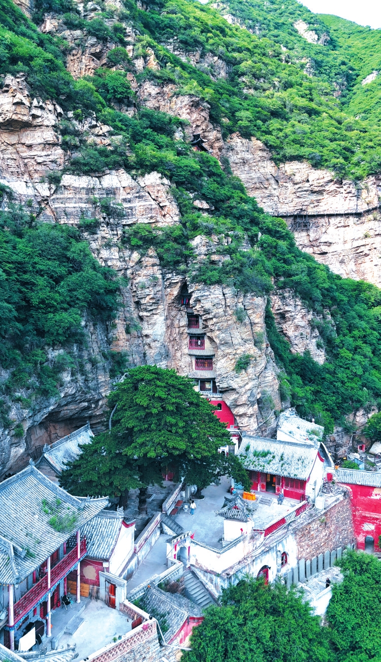 碑林深處,便是趙杲觀的心臟——朝元洞。其構(gòu)造堪稱鬼斧神工:五層木樓如寶塔斜倚,層層內(nèi)縮,依次塑有彌勒、如來、玉皇大帝、玄天上帝、接引佛等諸佛像,鑲嵌于峭壁間一道天然巨縫之中。自底層洞門入內(nèi),需援鐵鏈攀援而上,至第三層始有木梯。及至頂層,爬出洞口,蒼茫山色盡收眼底,恍然有置身蓬萊之幻。相傳此洞正是趙杲當(dāng)年餐霞飲露、靜觀世變的隱修之所。